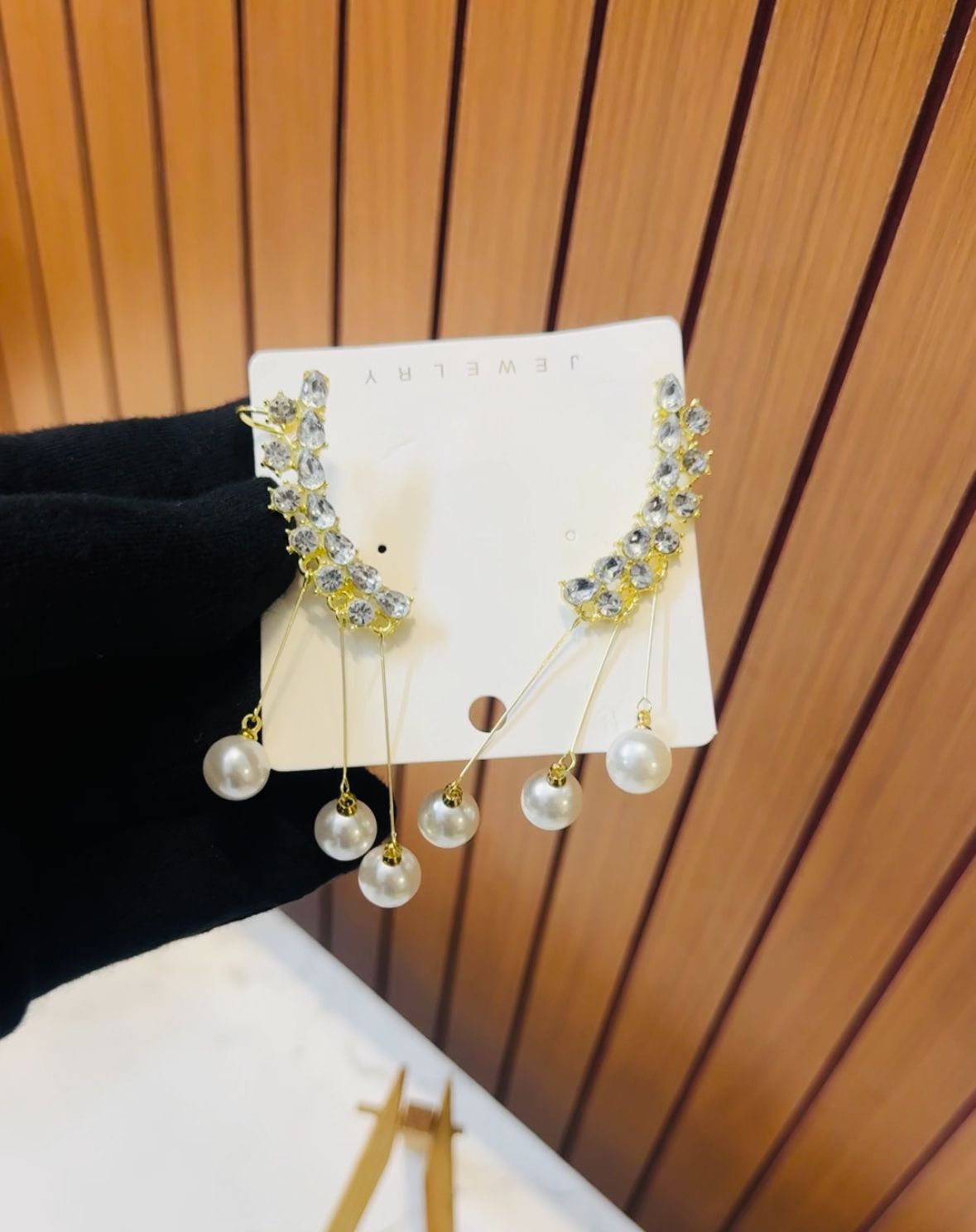 Stunning long earrings with sparkling crystal studs and multiple pearl danglers for a glamorous, modern look. Perfect for weddings, parties, and festive occasions.
