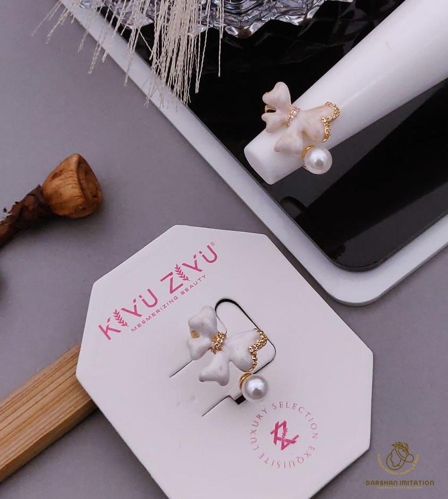 This chic adjustable ring features a delicate white enamel bow with subtle textured accents, adorned with tiny sparkling stones. A single, classic pearl dangles gracefully below, adding a touch of sophistication to the sweet and charming design.