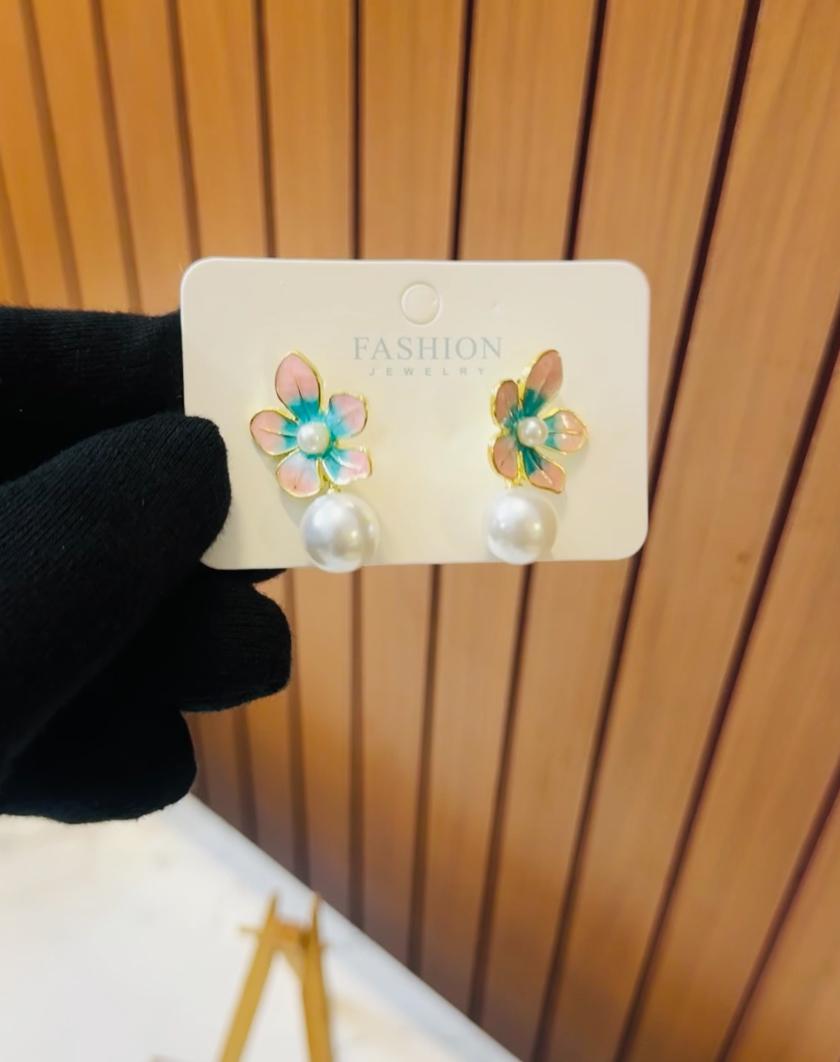 These pretty earrings showcase a delicate flower design with pink and blue petals, centered with a small pearl. A larger pearl drop hangs below, adding an elegant touch. Perfect for everyday wear or special occasions, these earrings are lightweight and charming.
